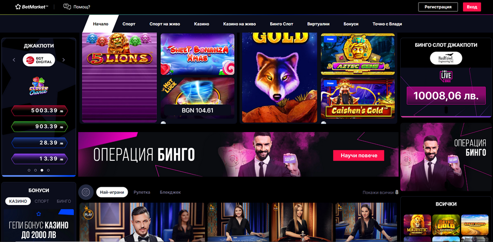 След като Бетмаркет е най-новият хазартен оператор у нас, не трябва да бъдем твърде критични към предложенията в сектора виртуално казино. За разлика от другите наложили се оператори на родния пазар за залози, букито не може да се похвали с богата селекция от онлайн ротативки и игри на маса. Въпреки това Бетмаркет също предлага превърналото се в предпочитано място за потребителите на хазартни услуги „Казино на живо“.