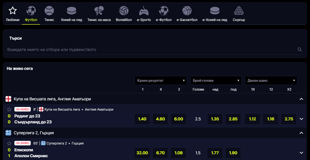 Най-голям интерес сред феновете на залаганията предизвикват срещите, които се случват в момента. За да получите достъп до пълната информация в този раздел, трябва да изберете предпочитания спорт, на който ще залагате. След това се визуализират всички събития от дисциплината, влизащи в селекцията „На живо“. Има вариант и да изберете спорт или турнир, който ще визуализира всички ваши предпочитани мачове. Това става с натискането на бутона „Любими“.