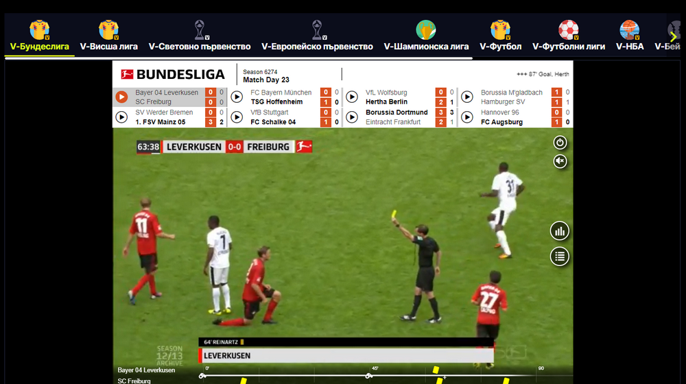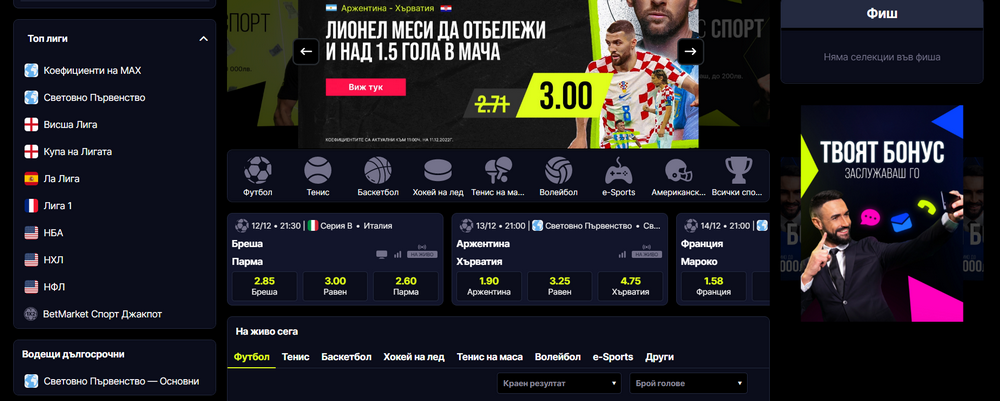 На централно място в сектора Спорт са поместени актуалните мачове от деня, които се играят в момента. В дясната част на екрана е разположен електронният фиш.