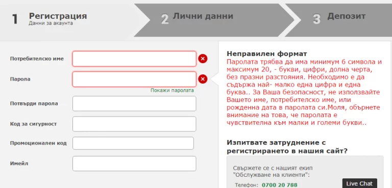 В полето имейл, напишете валиден имейл адрес. Стъпка 2 е за Лични данни, като при нея е нужно да попълвате националност, език, валута, пол, номер за контакт, име и фамилия, дата на раждане. Също така трябва да попълните полето за ЕГН и адрес.