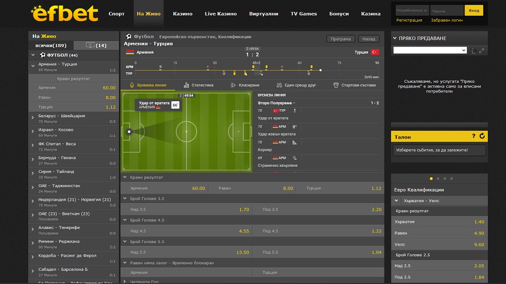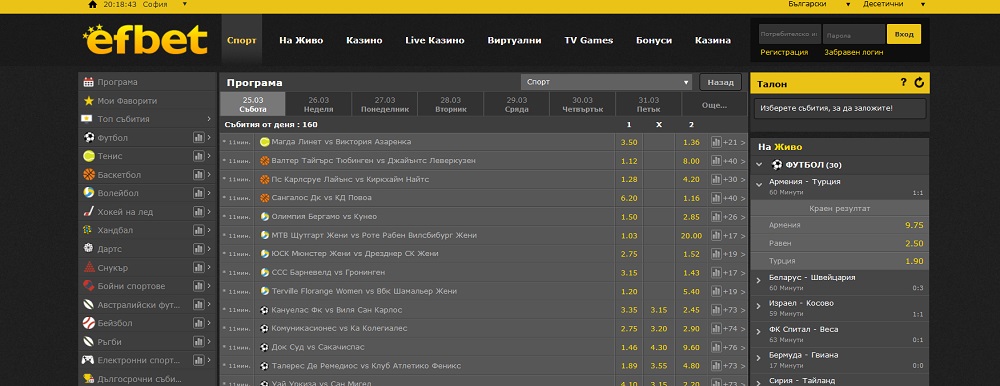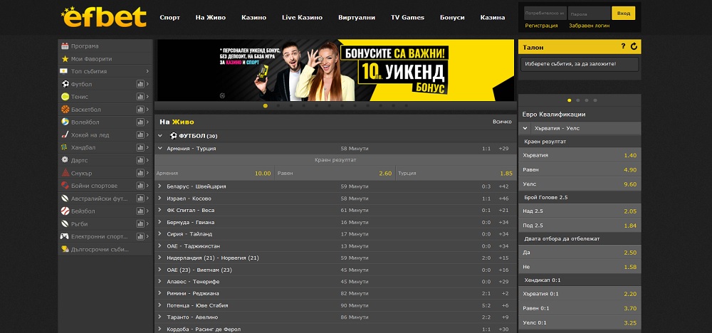 В Спорт на живо, Ефбет предлагат футболни срещи и други видове спортове, които се играят в момента и които са налични за залози. Това е предпочитана секция, тъй като можете бързо да разберете дали печелите или не, като имате възможност да залагате почти до края на дадено спортно събитие. При печалба баланса се нанася много бързо в акаунта ви.